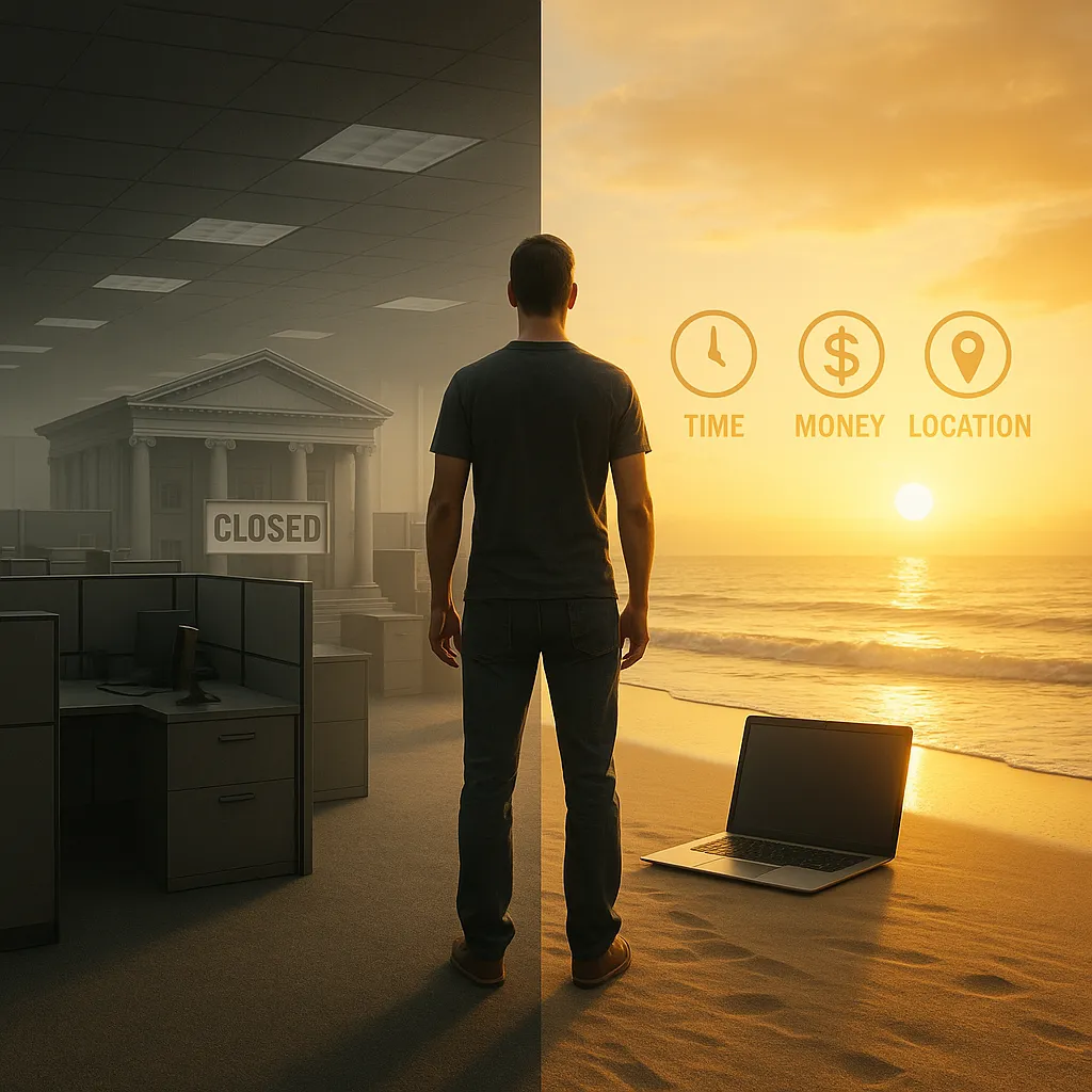 E2E stands for Employee to Entrepreneur. It is a practical system for professionals who want time, money, and location freedom. You will rewire your mindset, pick a paying niche, launch a simple offer, and use AI automations so revenue is not tied to a paycheck.